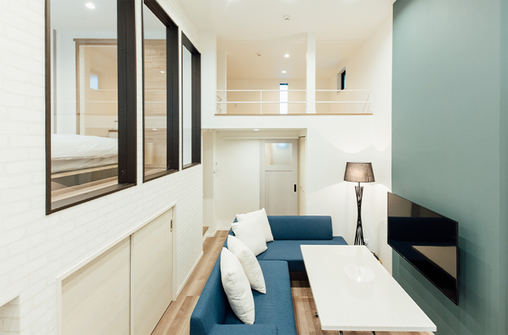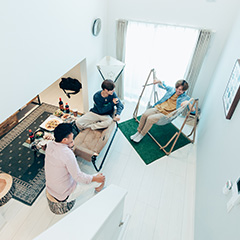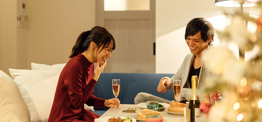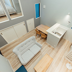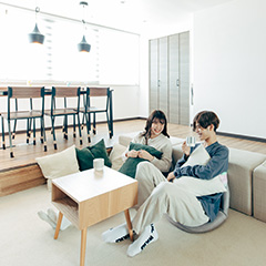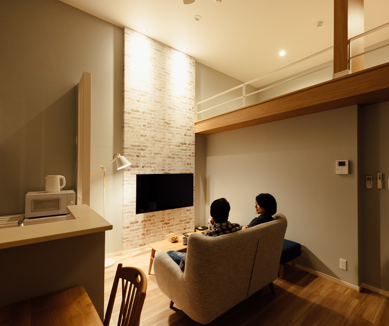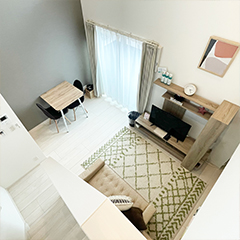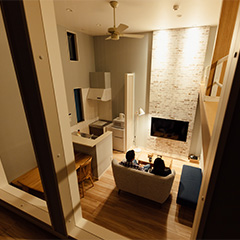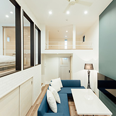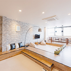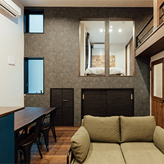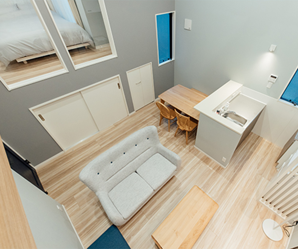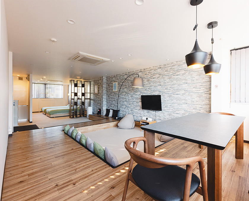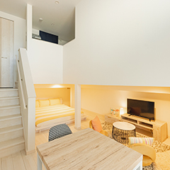 1〜3名様で過ごすのに最適な空間です。エントランスから階段を降りるとリビング、というワクワクする間取りはまるで「秘密基地」。パートナーとのプチ同棲や、1人での気分転換、仕事や勉強に集中したり、女子会などにもおすすめです。もちろん設備も充実しているので、長期滞在にも。